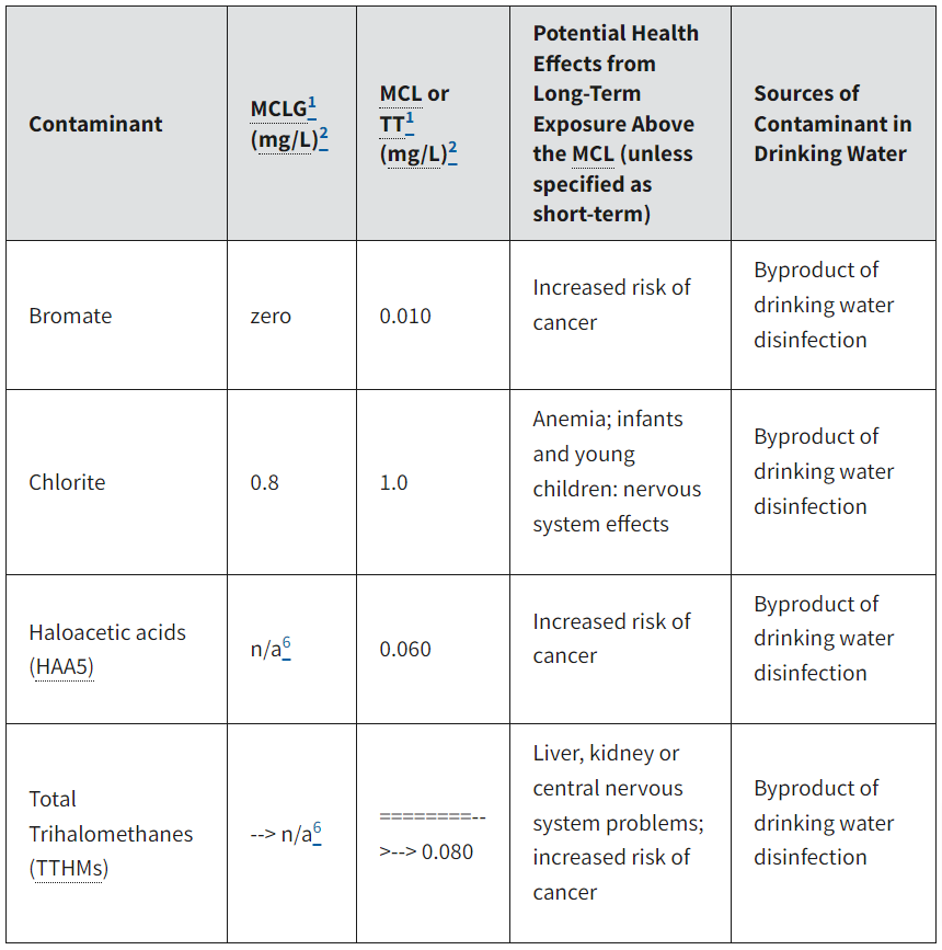 - Trihalomethanes: bromodichloromethane (zero); bromoform (zero); dibromochloromethane (0.06 mg/L): chloroform (0.07 mg/L.